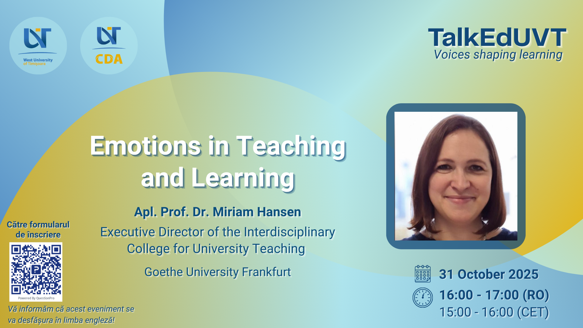 Centrul de Dezvoltare Academică (CDA) al UVT are bucuria de a vă invita la prima seria de webinare TalkEdUVT Voices shaping learning. Această inițiativă își propune să reunească comunitatea academică a UVT și cea a universităților din consorțiul UNITA într-un dialog internațional despre educația bazată pe evidențe, identitatea cadrului didactic universitar, competențele viitorului, gestionarea predării și a emoțiilor în contextul genAI și multe alte teme de interes. Invitați de renume internațional vor aduce în atenția dvs. studii de caz, instrumente concrete și idei „gata de pus în practică” în sala dumneavoastră de curs/seminar.
