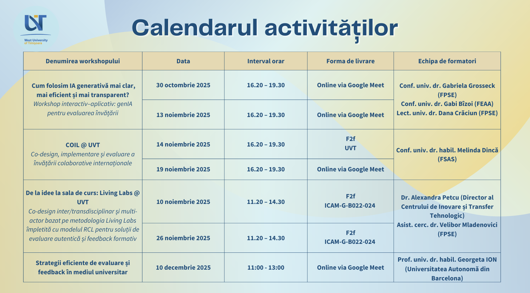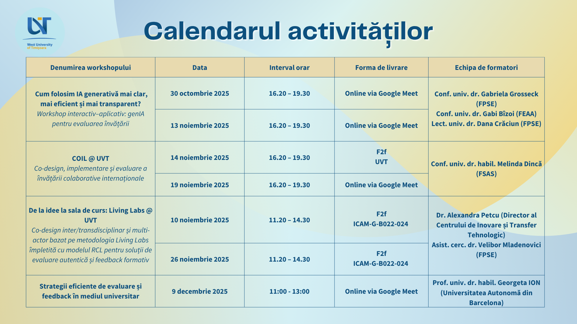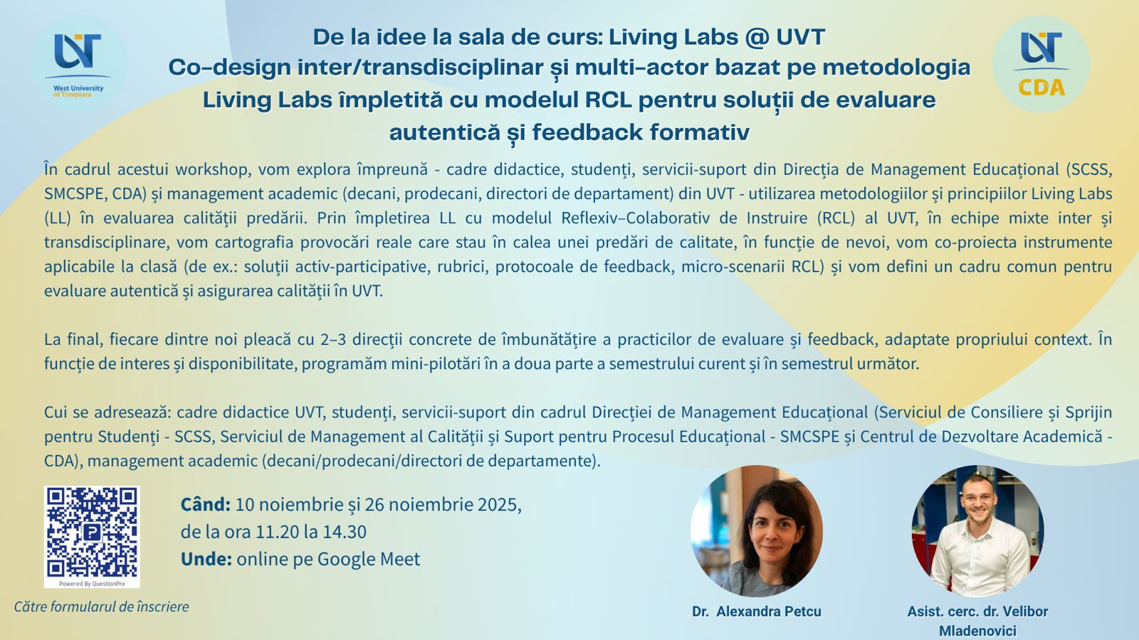 În perioada octombrie – decembrie 2025, echipa CDA invită membrii comunității academice a UVT preocupați de modernizarea activităților instructiv – educative să participe la aceste workshopuri.