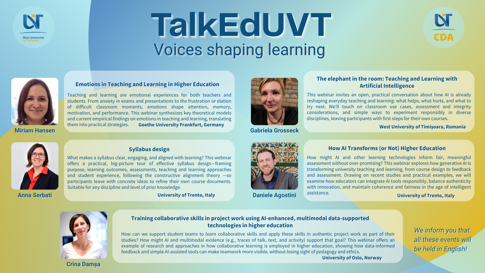 Centrul de Dezvoltare Academică (CDA) al UVT are bucuria de a vă invita la prima seria de webinare TalkEdUVT Voices shaping learning. Această inițiativă își propune să reunească comunitatea academică a UVT și cea a universităților din consorțiul UNITA într-un dialog internațional despre educația bazată pe evidențe, identitatea cadrului didactic universitar, competențele viitorului, gestionarea predării și a emoțiilor în contextul genAI și multe alte teme de interes. Invitați de renume internațional vor aduce în atenția dvs. studii de caz, instrumente concrete și idei „gata de pus în practică” în sala dumneavoastră de curs/seminar.